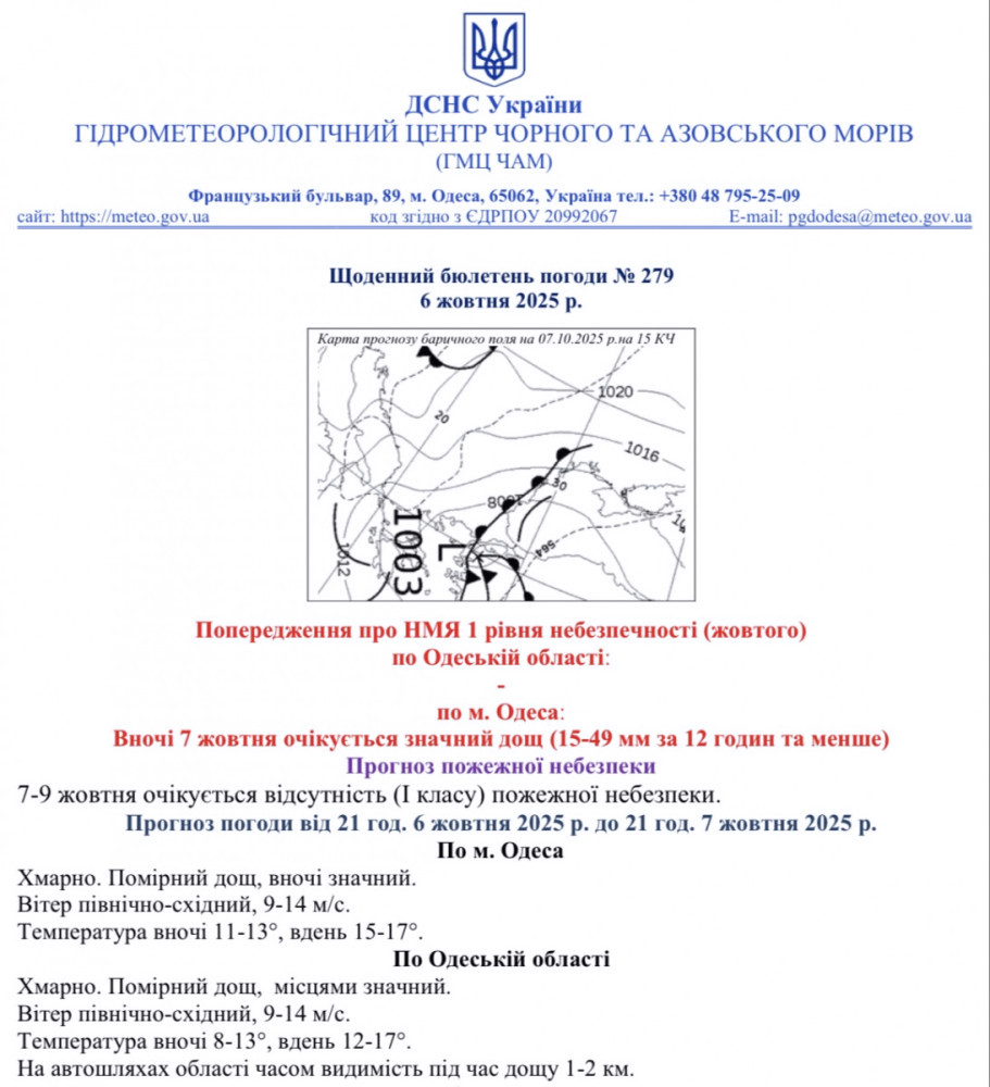 Прогноз погоди на період з 21:00 6 жовтня 2025 р. до 21:00 7 жовтня 2025 р.