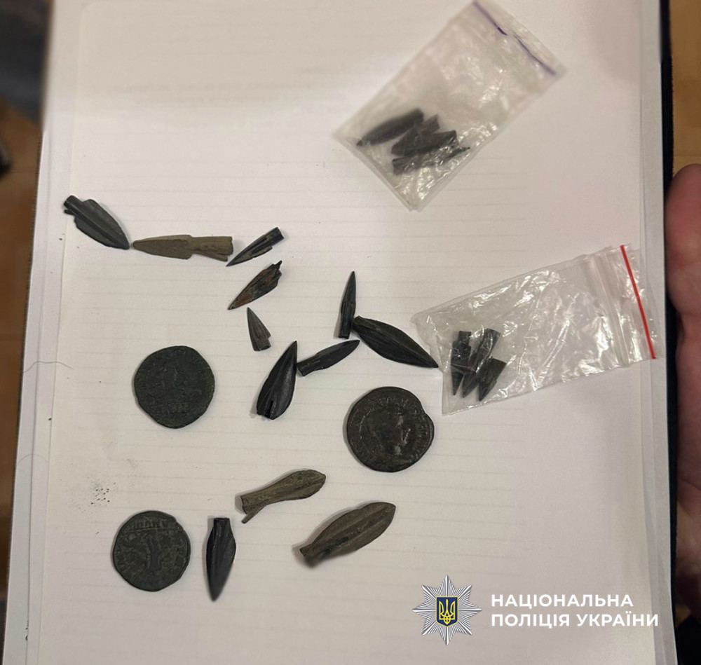 Під час санкціонованого обшуку за місцем проживання правопорушника, були вилучені вказана «Римська накладка», три монети «Гордіан ІІІ» та 19 наконечників для стріл.