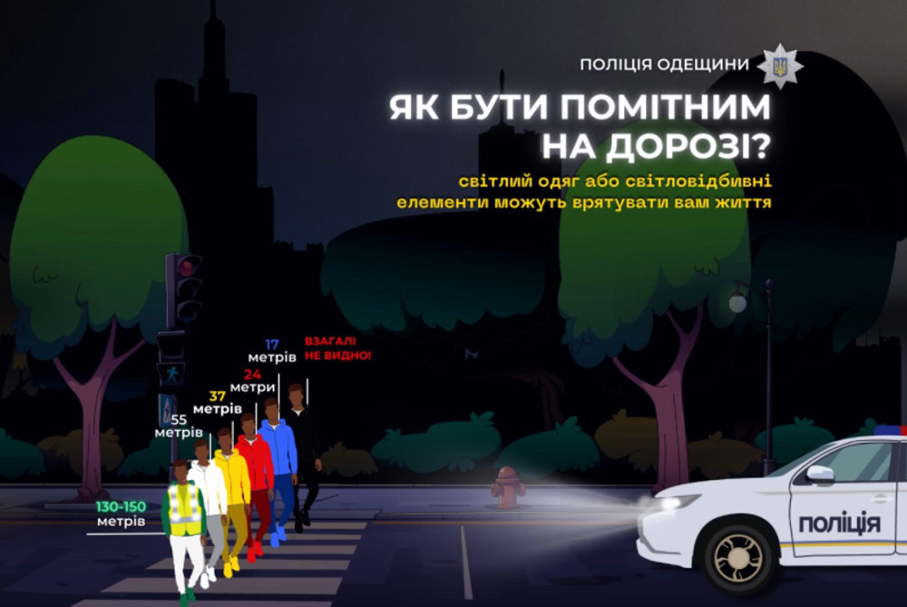 Зверніть увагу, що пішохід у світловідбиваючому одязі помітний з відстані 130-150 метрів, що дає водіям можливість вчасно зреагувати і зупинитися.